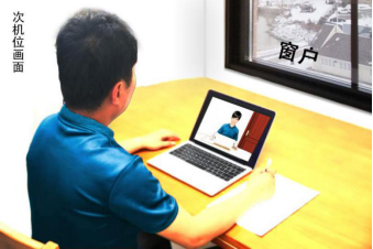 主機位為面試主機位(最好為筆記本電腦或臺式機),面向考生,用于考官對考生的遠程視頻考核。放置面試主機位的書桌應緊貼墻面擺放,主機位攝像頭覆蓋房間門口??荚囬_始時考生將主機位攝像頭環(huán)繞360度,使面試人員查看考場全部場景。考生本人正對設備攝像頭,保持坐姿端正,面部、上半身及雙手在畫面中清晰可見。示意圖如下: