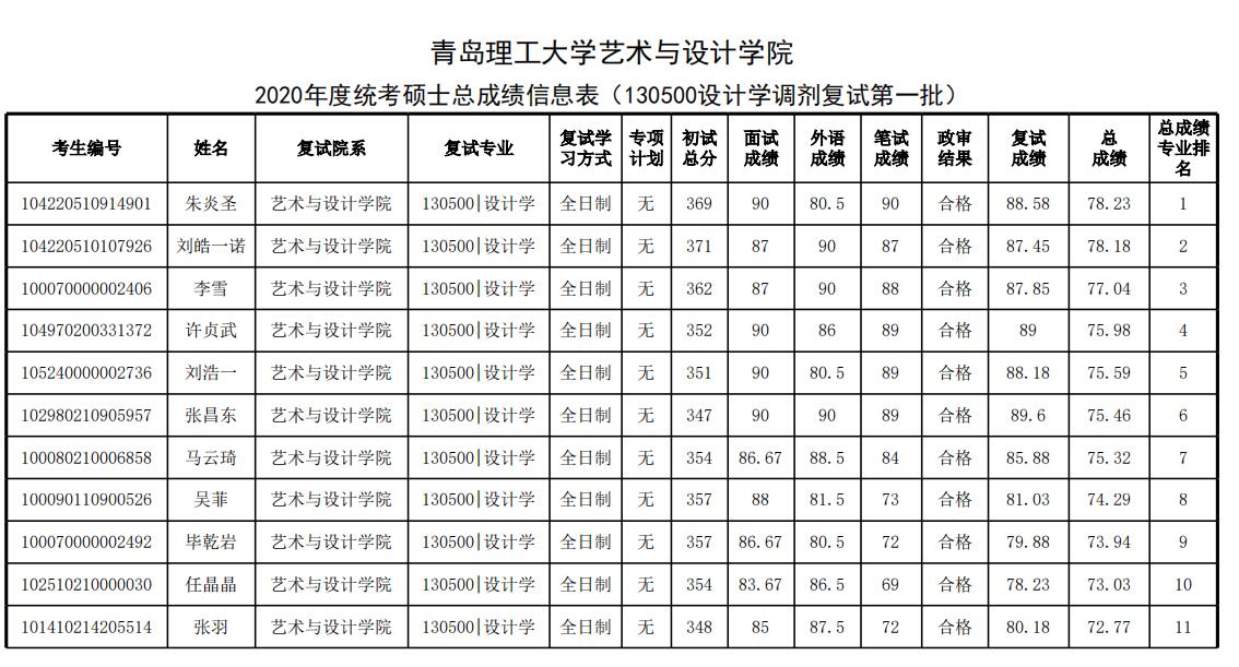 青島理工大學(xué)藝術(shù)設(shè)計(jì)學(xué)院2020年考研調(diào)劑復(fù)試成績(jī)公示 發(fā)布時(shí)間:2020-05-27 青島理工大學(xué)藝術(shù)設(shè)計(jì)學(xué)院2020年考研調(diào)劑復(fù)試成績(jī)公示 上一篇:青島理工大學(xué)藝術(shù)設(shè)計(jì)學(xué)院2020年考研復(fù)試成績(jī)公示 下一篇:青島理工大學(xué)2020年考研一志愿擬錄取名單