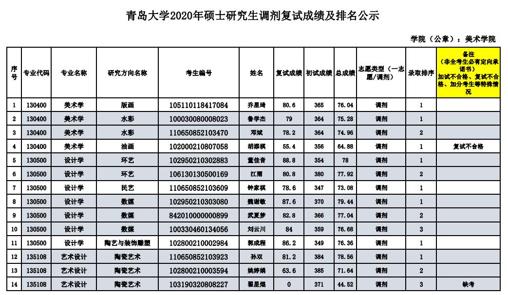 青島大學(xué)美術(shù)學(xué)院2020年考研錄取名單公示 發(fā)布時(shí)間:2020-05-19 青島大學(xué)美術(shù)學(xué)院2020年考研錄取名單公示 上一篇:青島大學(xué)機(jī)電工程學(xué)院2020年考研錄取名單公示 下一篇:2020年考研(統(tǒng)考)擬錄取名單