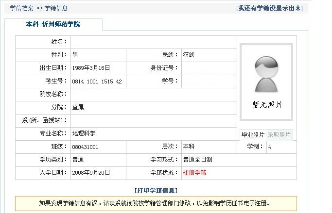 2、所有考生的資格審核以錄取結(jié)果上報教育部后的審核結(jié)果為準(zhǔn)。若考生在學(xué)信網(wǎng)無法查詢到本人信息(見附圖2)或?qū)W信網(wǎng)備案信息與報考信息不符(均會造成教育部錄取審核無法通過,無法錄取),請立即與本科院校相關(guān)部門聯(lián)系以盡快更正或按以下辦法進行學(xué)籍學(xué)歷認(rèn)證: