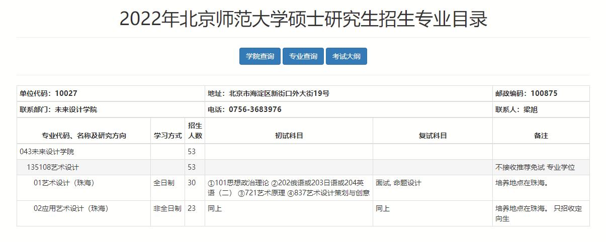 北京師范大學未來設計學院2022年考研招生目錄(第一年招生) 發(fā)布時間:2021-09-15 北京師范大學未來設計學院2022年考研招生目錄(第一年招生) 上一篇:北京師范大學未來設計學院簡介 下一篇:北京師范大學2022年考研考試大綱:721藝術原理