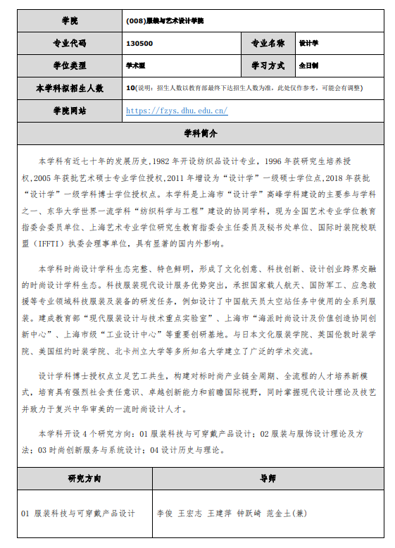 東華大學服裝與藝術設計學院2022年博士研究生招生目錄 發(fā)布時間:2021-11-30 東華大學服裝與藝術設計學院2022年博士研究生招生目錄 上一篇:東華大學2022年考研成績查詢及復核通知 下一篇:東華大學2022年考研復試分數(shù)線(工業(yè)設計工程)