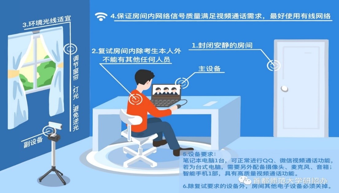 1.考生需要在安靜、明亮的房間獨(dú)立進(jìn)行遠(yuǎn)程面試,房間內(nèi)除考生本人不能有其他人員。周?chē)h(huán)境不得對(duì)復(fù)試產(chǎn)生干擾。視頻背景必須為真實(shí)環(huán)境。