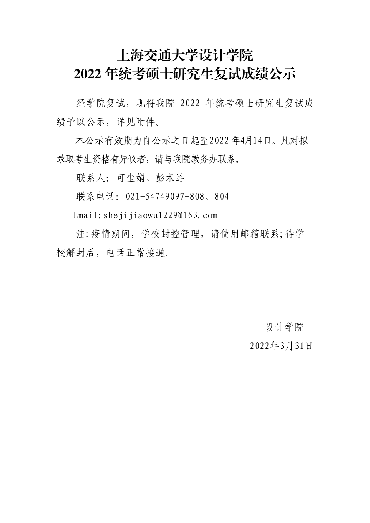 ?上海交通大學(xué)設(shè)計(jì)學(xué)院2022年考研復(fù)試成績(jī)公示 發(fā)布時(shí)間:2022-03-31 上海交通大學(xué)設(shè)計(jì)學(xué)院2022年考研復(fù)試成績(jī)公示 上一篇:上海交通大學(xué)2022年考研復(fù)試工作方案 下一篇:上海交通大學(xué)設(shè)計(jì)學(xué)院2023年考研招生目錄