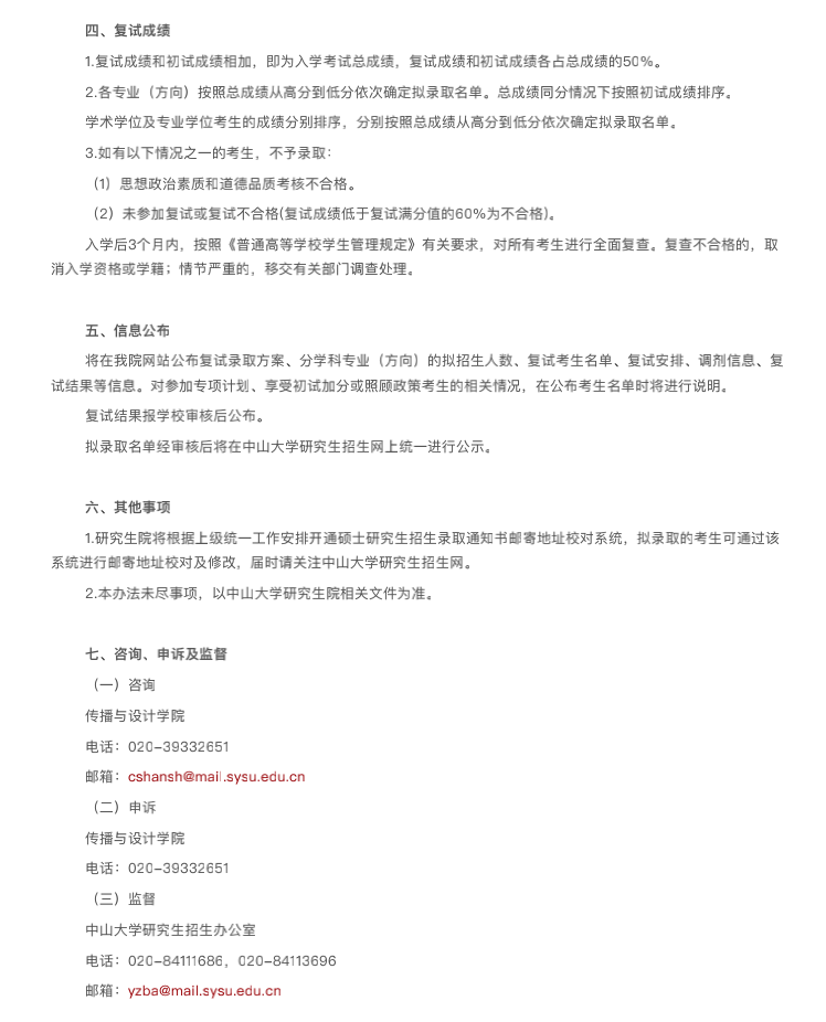 中山大學(xué)傳媒與設(shè)計學(xué)院2022年考研復(fù)試安排 發(fā)布時間:2022-03-23 中山大學(xué)傳媒與設(shè)計學(xué)院2022年考研復(fù)試安排 上一篇:中山大學(xué)2022年考研復(fù)試分數(shù)線發(fā)布 下一篇:中山大學(xué)傳媒與設(shè)計學(xué)院2022年考研復(fù)試名單