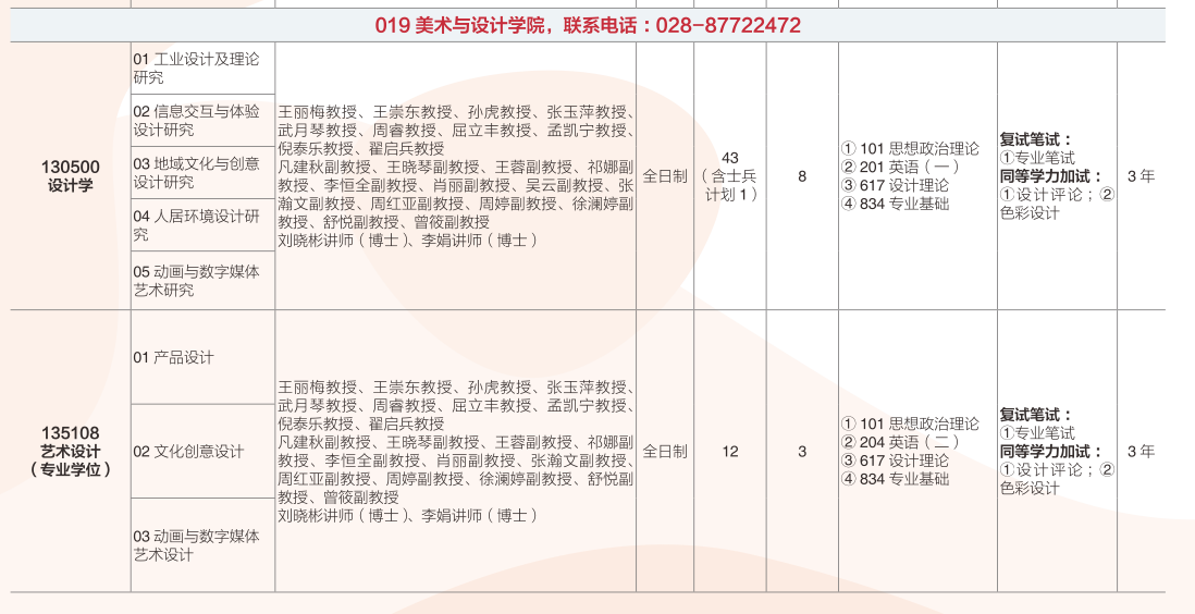 西華大學(xué)美術(shù)與設(shè)計學(xué)院2023年考研招生目錄 發(fā)布時間:2022-09-16 西華大學(xué)美術(shù)與設(shè)計學(xué)院2023年考研招生目錄更多考研信息咨詢微信18911516590(風(fēng)標(biāo)龔老師) 上一篇:西華大學(xué)美術(shù)與設(shè)計學(xué)院2022年考研招生人數(shù) 下一篇:西華大學(xué)美術(shù)與設(shè)計學(xué)院2023年考研參考書目