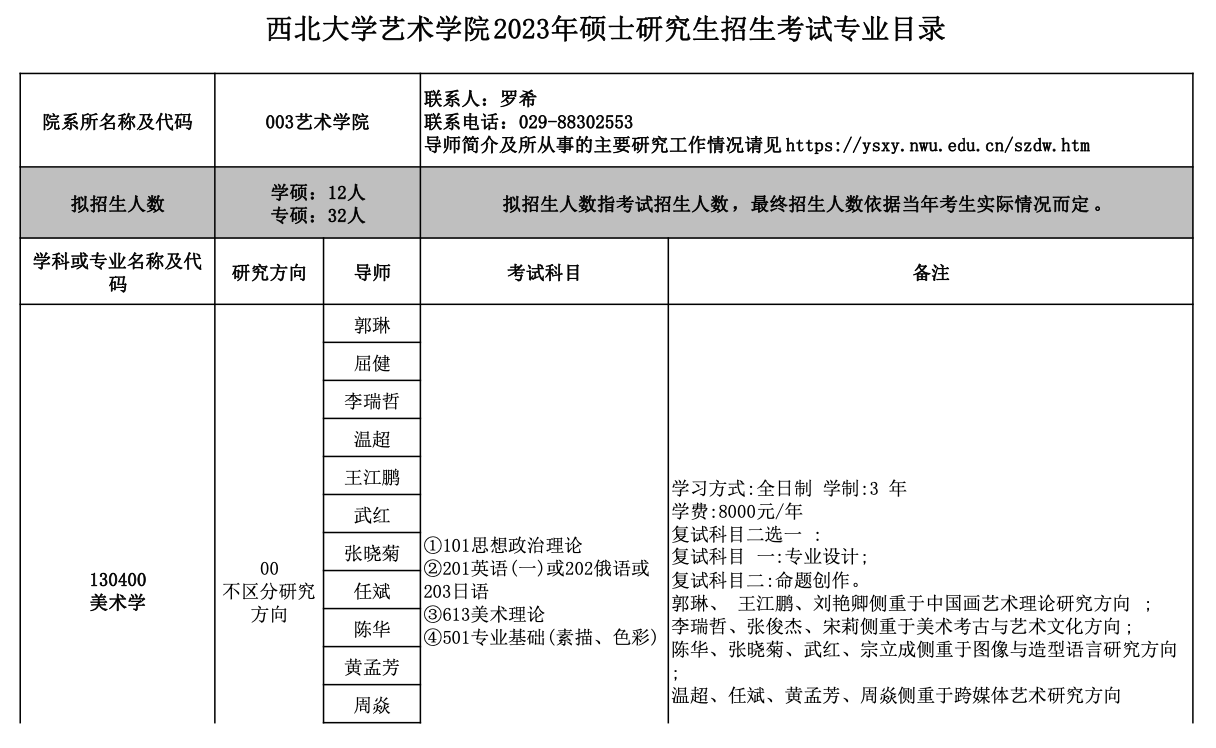 西北大學(xué)藝術(shù)學(xué)院2023年考研招生目錄 發(fā)布時間:2022-09-20 西北大學(xué)藝術(shù)學(xué)院2023年考研招生目錄 上一篇:西北大學(xué)藝術(shù)學(xué)院2022年考研復(fù)試擬錄取名單 下一篇:沒有了
