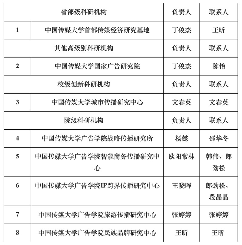學院主要科研機構(gòu)包括國家廣告研究院(國家工商行政管理總局批準設(shè)立)、中國廣告博物館、全國公益廣告創(chuàng)新研究基地、首都傳媒經(jīng)濟研究基地(入選CTTI國家智庫序列)等。
