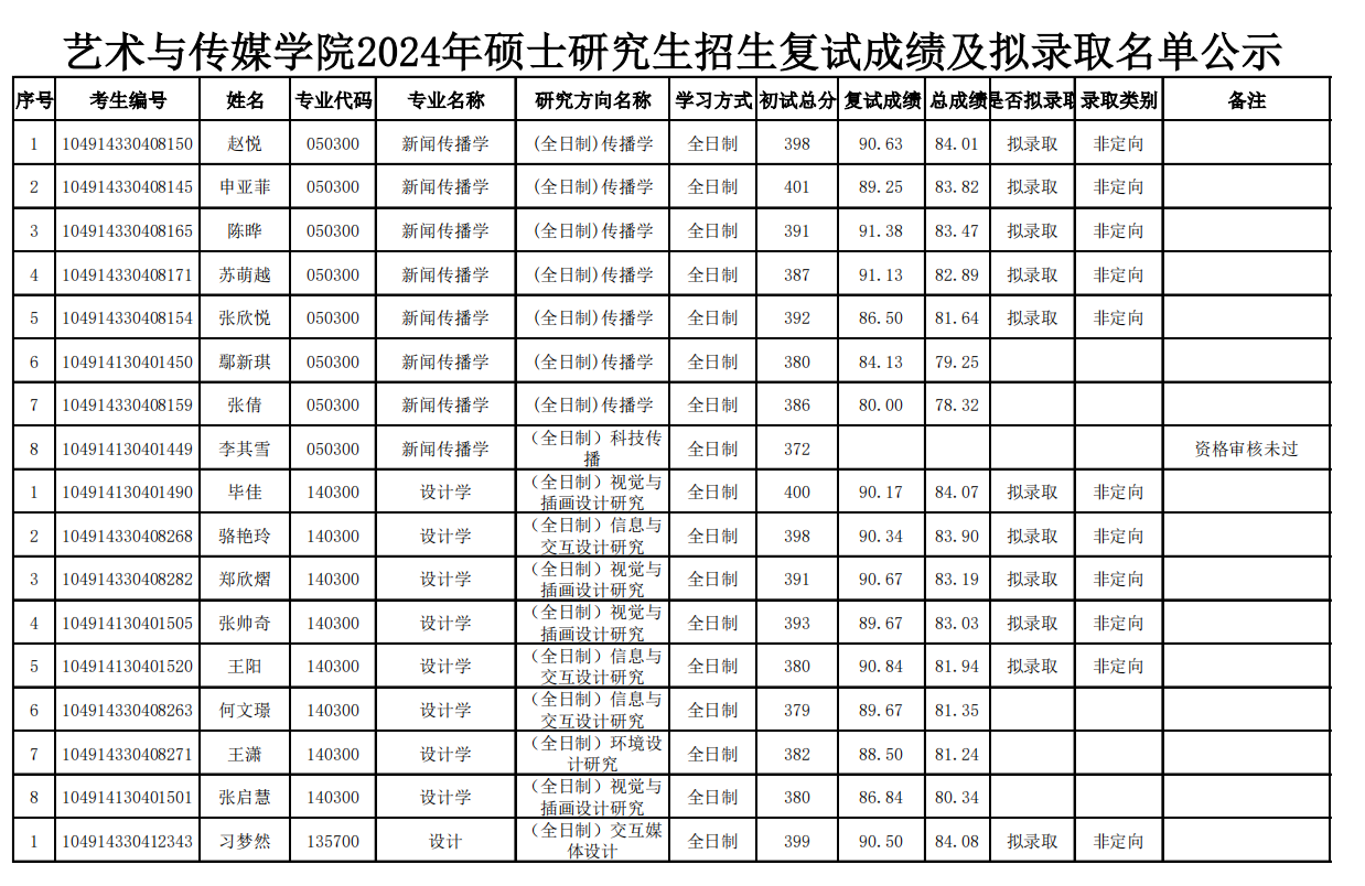 中國地質(zhì)大學(xué)藝術(shù)與傳媒學(xué)院2024年考研復(fù)試錄取結(jié)果 發(fā)布時間:2024-04-01 中國地質(zhì)大學(xué)藝術(shù)與傳媒學(xué)院2024年考研復(fù)試錄取結(jié)果 上一篇:中國地質(zhì)大學(xué)藝術(shù)與傳媒學(xué)院2024年考研復(fù)試分數(shù)線 下一篇:中國地質(zhì)大學(xué)工業(yè)設(shè)計考研2024年考研復(fù)試錄取名單