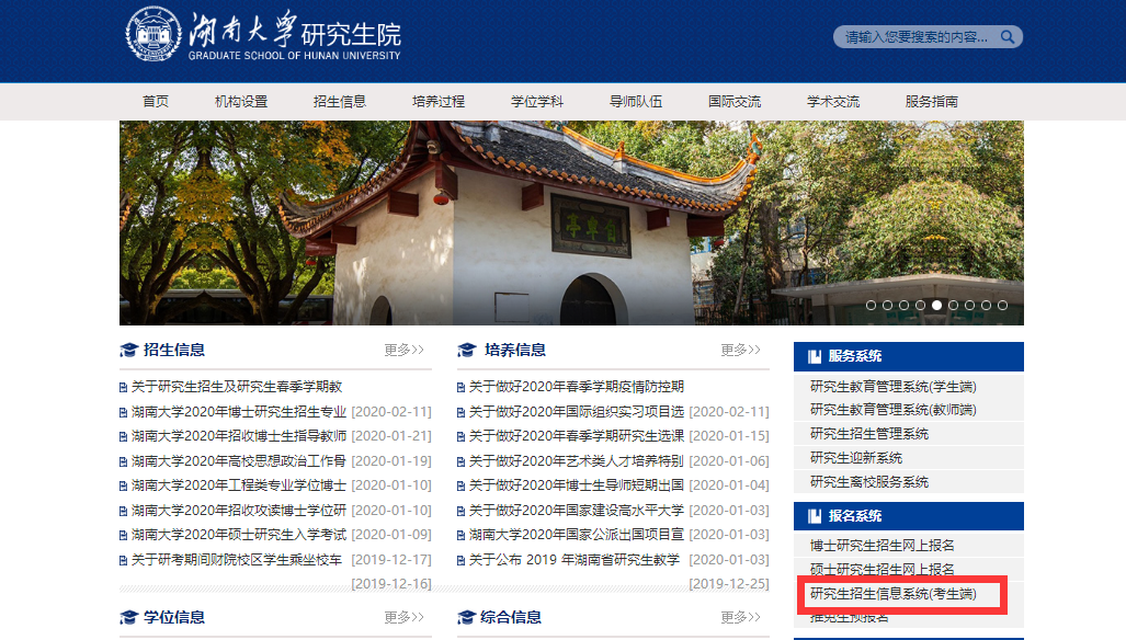 2. 申請(qǐng)方式:登錄“湖南大學(xué)研究生院網(wǎng)站”首頁的“研究生招生信息系統(tǒng)(考生端)”提交成績(jī)復(fù)核申請(qǐng)。此為成績(jī)復(fù)核唯一途徑,不單獨(dú)受理考生其他申請(qǐng)。