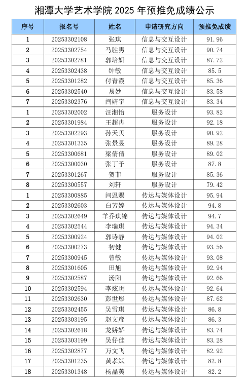 湘潭大學(xué)藝術(shù)學(xué)院2025年碩士研究生預(yù)推免成績公示 發(fā)布時間:2024-09-25 湘潭大學(xué)藝術(shù)學(xué)院2025年碩士研究生預(yù)推免成績公示 上一篇:湘潭大學(xué)2023年(藝術(shù))設(shè)計考研真題分享:597命題創(chuàng)作(一) 下一篇:湘潭大學(xué)藝術(shù)學(xué)院2025年考研招生目錄及招生人數(shù)