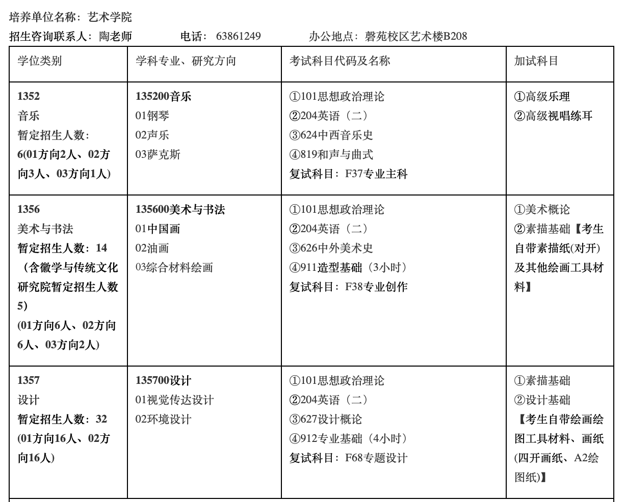 安徽大學(xué)藝術(shù)學(xué)院2025年設(shè)計(jì)考研招生目錄、招生人數(shù)及參考書目 發(fā)布時(shí)間:2024-10-04 上一篇:安徽大學(xué)藝術(shù)學(xué)院2025年保研復(fù)試成績(jī) 下一篇:安徽大學(xué)藝術(shù)學(xué)院2025年考研復(fù)試分?jǐn)?shù)線