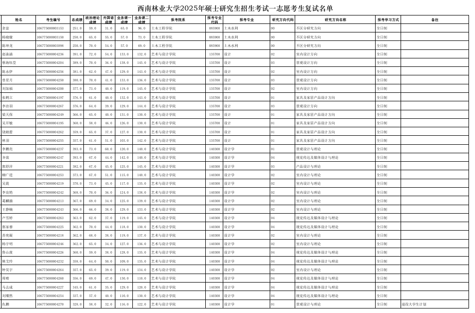 西南林業(yè)大學(xué)藝術(shù)與設(shè)計(jì)學(xué)院2025年考研復(fù)試名單發(fā)布 發(fā)布時(shí)間:2025-03-17 西南林業(yè)大學(xué)藝術(shù)與設(shè)計(jì)學(xué)院2025年考研復(fù)試名單發(fā)布 上一篇:西南林業(yè)大學(xué)藝術(shù)與設(shè)計(jì)學(xué)院2025年考研復(fù)試分?jǐn)?shù)線發(fā)布 下一篇:西南林業(yè)大學(xué)藝術(shù)設(shè)計(jì)學(xué)院2025年考研擬錄取名單