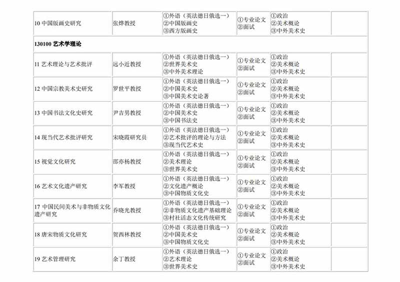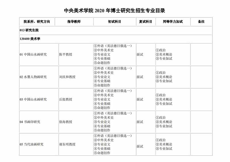 中央美術(shù)學(xué)院2020年博士研究生專業(yè)目錄 發(fā)布時(shí)間:2019-11-05 中央美術(shù)學(xué)院2020年博士研究生專業(yè)目錄 上一篇:中央美術(shù)學(xué)院2019年考研錄取名單 下一篇:中央美術(shù)學(xué)院2020年考研錄取名單公示
